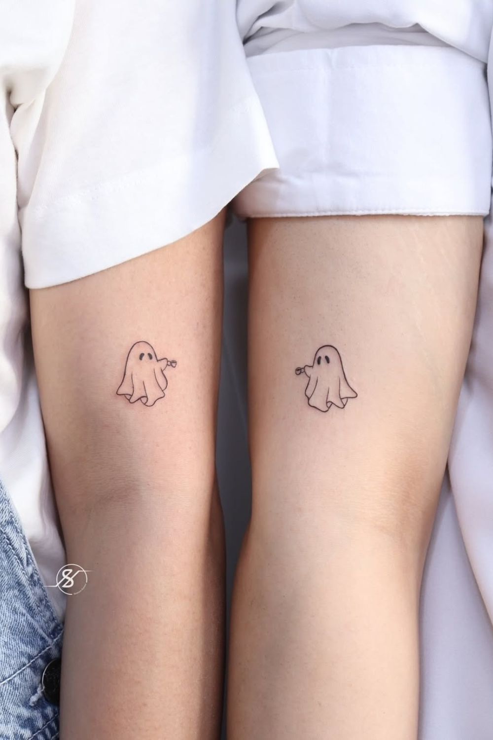 These adorable ghost tattoos are so playful and sweet. Ghosts traditionally symbolize connections beyond the physical realm, but here they’re softened and romanticized as friendly spirits bearing gifts for one another. The minimalist black ink keeps them whimsical rather than spooky. The upper arm placement makes them easy to hide or reveal. It’s quirky and endearing, celebrating a love that’s eternal, playful, and refuses to be bound by the ordinary rules of existence.